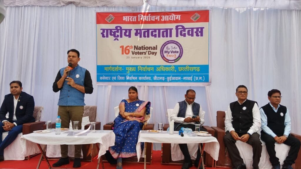 सत्यमेव न्यूज खैरागढ़। जिला कार्यालय परिसर (कलेक्ट्रेट) में 16वां राष्ट्रीय मतदाता दिवस पूरे उत्साह और सकारात्मक माहौल के साथ मनाया गया। कार्यक्रम का आयोजन भारत निर्वाचन आयोग की थीम “मेरा भारत, मेरा वोट, मैं भारत हूं” के अनुरूप किया गया। मुख्य अतिथि जिला एवं अपर सत्र न्यायाधीश केसीजी मोहिनी कंवर रहीं। कार्यक्रम की अध्यक्षता कलेक्टर एवं जिला निर्वाचन अधिकारी इन्द्रजीत सिंह चंद्रवाल ने की। इस अवसर पर पुलिस अधीक्षक लक्ष्य शर्मा, वनमंडलाधिकारी पंकज सिंह राजपूत और जिला पंचायत सीईओ एवं स्वीप नोडल अधिकारी प्रेम कुमार पटेल भी मौजूद रहे। मोहिनी कंवर ने उपस्थित अधिकारियों कर्मचारियों और नागरिकों को मतदाता शपथ दिलाई तथा कहा कि मतदान लोकतंत्र की सबसे बड़ी ताकत है। उन्होंने सभी नागरिकों से निर्भय होकर मतदान करने की अपील की। कलेक्टर इन्द्रजीत सिंह चंद्रवाल ने भी मतदाताओं को लोकतंत्र का आधार बताते हुए जागरूक भागीदारी का संदेश दिया।