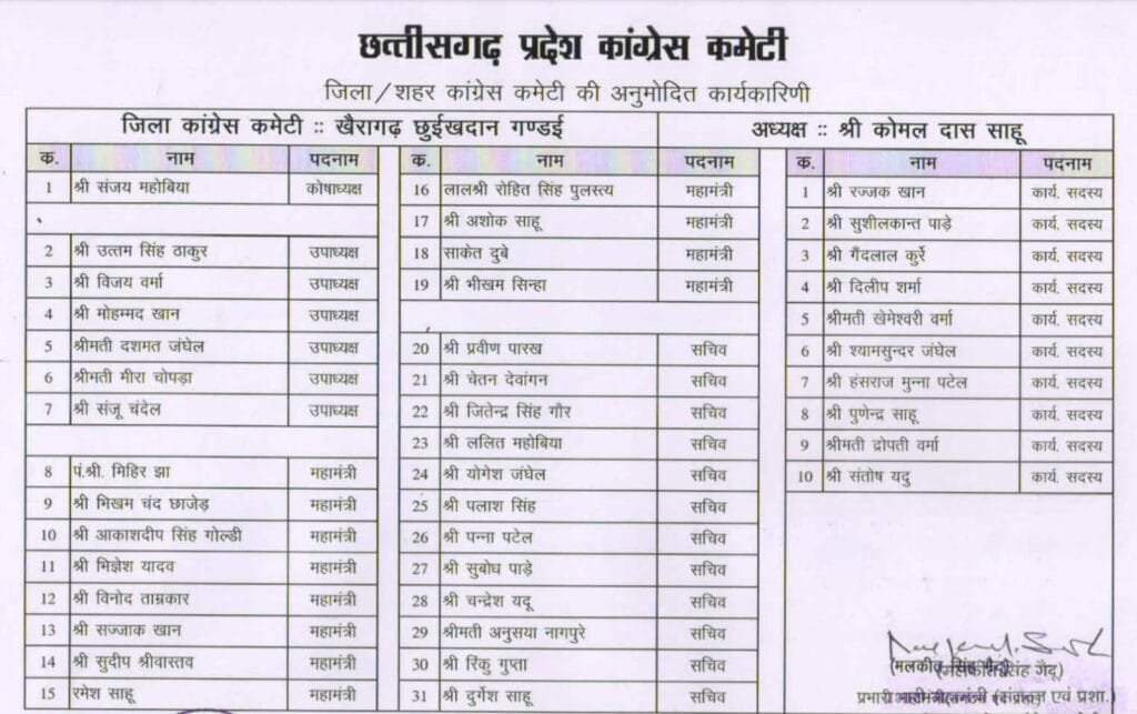 प्रवीण पारख, चेतन देवांगन, जितेन्द्र सिंह गौर, ललित महोबिया, योगेश जंघेल, पलाश सिंह, पन्ना पटेल, सुबोध पांडे, चन्द्रेश यादव, श्रीमती अनुसुइया नागपुरे, रिंकू गुप्ता तथा दुर्गेश साहू को सचिव नियुक्त किया गया है वहीं कार्यकारिणी सदस्य के रूप में जिला कांग्रेस के वरिष्ठ नेता रज्जाक खान, सुशीलकांत पांडे, गेंदलाल कुर्रे, दिलीप शर्मा, श्रीमती खेमेंश्वरी वर्मा, श्यामसुंदर जंघेल, हंसराज मुन्ना पटेल, पुनेन्द्र साहू, श्रीमती द्रौपदी वर्मा एवं संतोष यदु को जिम्मेदारी दी गई है। प्रदेश कांग्रेस कमेटी द्वारा जारी निर्देश में कहा गया है कि अनुमोदित कार्यकारिणी के पदाधिकारियों को शीघ्र सूचित कर संगठन के कार्यक्रमों को गति प्रदान करने हेतु आवश्यक कार्यवाही की जाए। नई कार्यकारिणी के गठन से कांग्रेस के एक खेमे में जहां उत्साह और जश्न का माहौल है वहीं विधायक समर्थक खेमे में मायूसी देखने को मिल रही है।