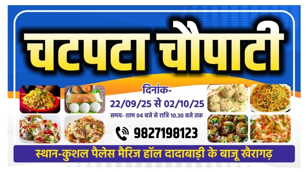 सत्यमेव न्यूज के लिए आकाश तिवारी खैरागढ़। इस नवरात्रि खैरागढ़वासियों के लिए खुशखबरी है। शहर में पहली बार ‘चटपटा चौपाटी का आयोजन किया जा रहा है। 22 सितंबर से नवरात्रि के प्रथम दिन शुरू होकर यह चौपाटी 2 अक्टूबर दशहरा तक चलेगी।