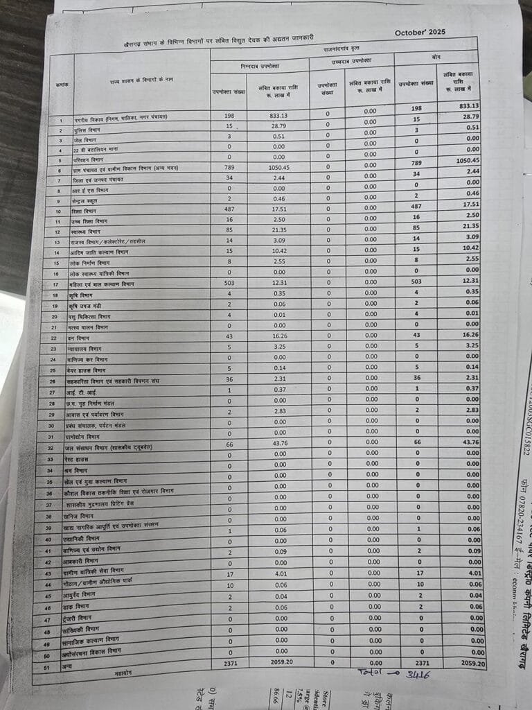 अगर विभागवार स्थिति देखें तो नगरीय निकायों पर लगभग 8 करोड़ 33 लाख रुपये, पंचायत एवं ग्रामीण विकास विभाग पर करीब 10 करोड़ 50 लाख रुपये का बिजली बिल बकाया है। इसके अलावा शिक्षा, स्वास्थ्य, महिला एवं बाल विकास, आदिम जाति कल्याण, वन और जल संसाधन विभाग भी बकायेदारों की सूची में शामिल हैं। इन सभी को जोड़ने पर कुल राशि 20 करोड़ रुपये से अधिक पहुंच जाती है।
