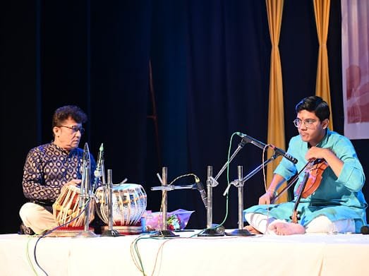 पहली प्रस्तुति में वायलिन वादक पुष्कर भागवत ने तबला संगतकार अशोक मुखर्जी के साथ राग शुद्ध कल्याण और देश की मधुर प्रस्तुति दी। उनकी उंगलियों से झरती धुनों ने सभागार को मंत्रमुग्ध कर दिया।