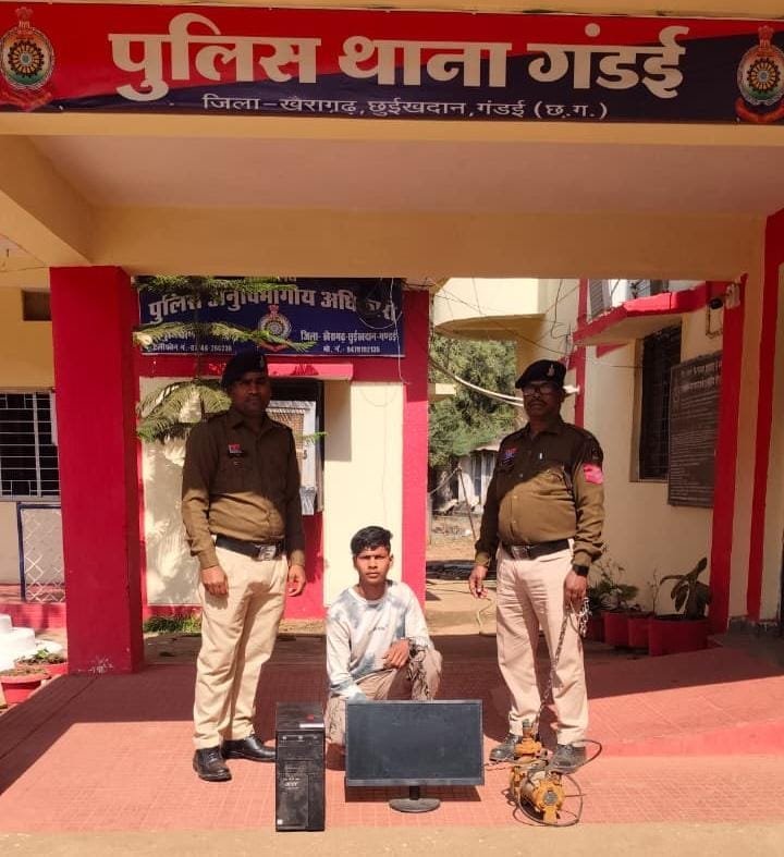 सत्यमेव न्यूज गंडई। जिला खैरागढ़ छुईखदान गंडई (केसीजी) में आपराधिक गतिविधियों पर प्रभावी अंकुश लगाने की दिशा में पुलिस को महत्वपूर्ण सफलता मिली है। थाना गंडई पुलिस ने पशु चिकित्सालय में हुई चोरी के मामले का खुलासा करते हुए एक आदतन आरोपी को गिरफ्तार किया है। आरोपी के कब्जे से चोरी किया गया पूरा सामान बरामद कर लिया गया है। जानकारी अनुसार 27 अक्टूबर 2025 को प्रार्थी श्याम लाल चातर बिदनी (58 वर्ष) निवासी पशु चिकित्सालय परिसर गंडई ने थाना गंडई में रिपोर्ट दर्ज कराई थी कि 24 अक्टूबर 2025 की रात अज्ञात चोर ने कार्यालय का ताला तोड़कर अंदर रखे कम्प्यूटर मॉनिटर, सीपीयू, पेन ड्राइव और डूल पम्प चोरी कर लिए। चोरी सामान की कुल कीमत लगभग 13,600 रुपये आंकी गई थी। रिपोर्ट पर थाना गंडई में धारा 331 305(ए) बीएनएस के तहत मामला दर्ज कर विवेचना प्रारंभ की गई। घटना के बाद से पुलिस अज्ञात आरोपी की तलाश में जुटी थी। इसी दौरान मुखबिर से सूचना मिली कि शेख वसीम उर्फ आयुष खान (18 वर्ष) निवासी वार्ड नंबर 06 कंपोजिट गंडई ने अपने घर के पीछे बाड़ी में बनी झोपड़ी के अंदर एक बड़ी पेटी में चोरी का सामान छिपाकर रखा है।
