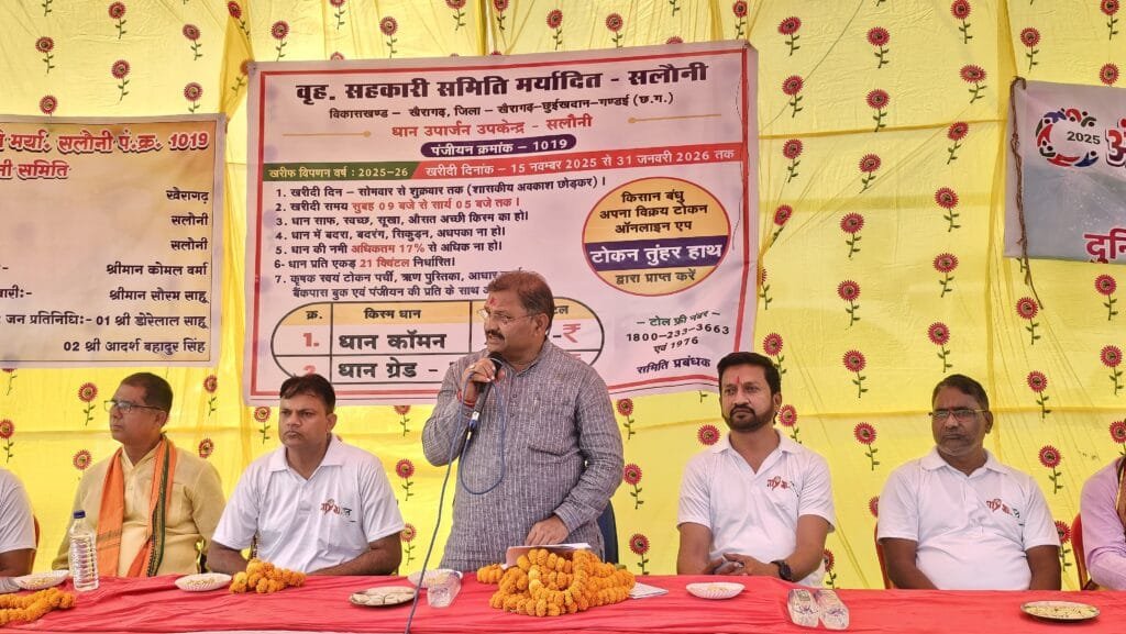 सत्यमेव न्यूज खैरागढ़। जिले में समर्थन मूल्य पर धान उपार्जन सत्र का आज से शुभारंभ हो गया। राज्यव्यापी खरीदी व्यवस्था के साथ खैरागढ़–छुईखदान–गंडई जिले में भी 39 सहकारी समितियों के अंतर्गत संचालित 51 धान उपार्जन केंद्रों में खरीदी कार्य विधिवत प्रारंभ हुआ। ग्राम सलौनी स्थित उपार्जन केंद्र में आयोजित औपचारिक कार्यक्रम में सांसद संतोष पांडे ने छत्तीसगढ़ महतारी की पूजा-अर्चना कर व किसानों के धान की तौल कराकर खरीदी सत्र का शुभारंभ किया। इस अवसर पर जिला पंचायत उपाध्यक्ष विक्रांत सिंह, जिला पंचायत अध्यक्ष प्रतिनिधि खम्हन ताम्रकार, जिपं सभापतिद्वय ललित चोपड़ा, दिनेश वर्मा, क्षेत्रीय जनपद सदस्य खेमराज जैन, पूर्व विधायक कोमल जंघेल, जिला भाजपा अध्यक्ष बिशेसर साहू, जनपद उपाध्यक्ष लखन साहू, सेवा सहकारी समिति सलोनी के अध्यक्ष कोमल वर्मा, जिला भाजयुमो अध्यक्ष आयश सिंह बोनी, जनपद सभापति शैलेंद्र मिश्रा, जनपद अध्यक्ष प्रतिनिधि डॉ.शैलेंद्र त्रिपाठी सहित विशेष तौर पर कलेक्टर इंद्रजीत सिंह चंद्रावल, एडीएम सुरेंद्र ठाकुर, एसडीएम टीपी साहू, जालबांधा चौकी प्रभारी बीरेंद्र चंद्राकर, तहसीलदार आशीष देवहारी, समिति प्रबंधक प्रेमप्रकाश यदु सहित क्षेत्र के प्रगतिशील कृषक मकसूदन वर्मा, रवींद्र वर्मा, पुराणिक वर्मा, भूषण वर्मा, पीतांबर वर्मा, नीलकुमार वर्मा सहित ग्रामीण उपस्थित रहे।