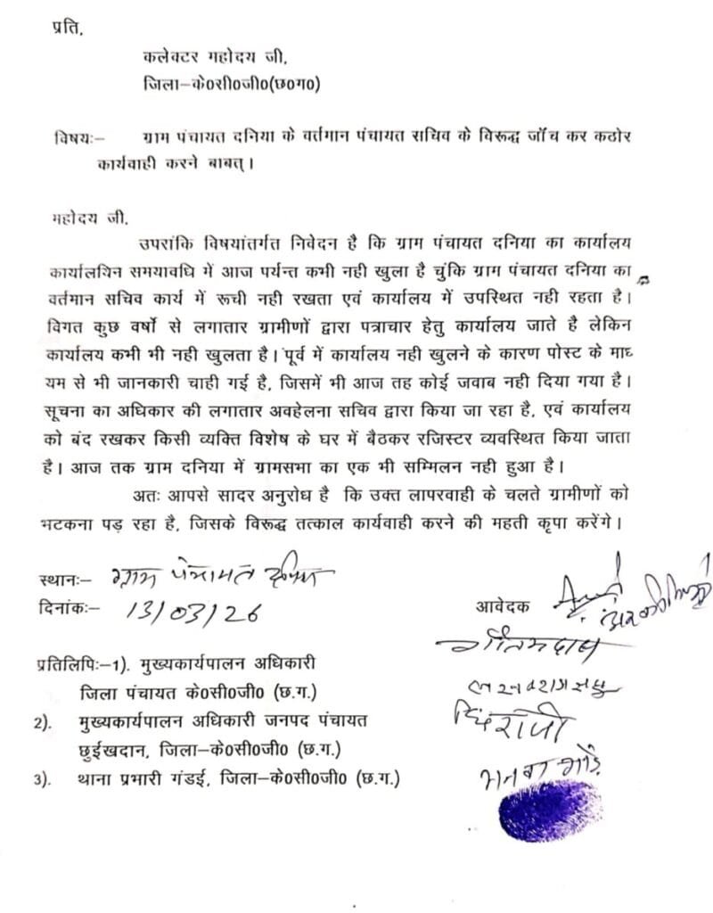 सत्यमेव न्यूज खैरागढ़। जिले के ग्राम पंचायत दनिया के वर्तमान पंचायत सचिव के खिलाफ ग्रामीणों ने गंभीर लापरवाही और अनियमितताओं का आरोप लगाते हुए कलेक्टर को शिकायत पत्र सौंपकर जांच कर कठोर कार्रवाई की मांग की है। शिकायत में कहा गया है कि पंचायत सचिव द्वारा लंबे समय से कार्यालय का नियमित संचालन नहीं किया जा रहा है जिससे ग्रामीणों को विभिन्न कार्यों के लिए भटकना पड़ रहा है। ग्रामीणों द्वारा दिए गए शिकायत पत्र में उल्लेख किया गया है कि ग्राम पंचायत दनिया का कार्यालय कार्यालीन समय में आज तक नियमित रूप से नहीं खुलता। पंचायत सचिव अक्सर कार्यालय में उपस्थित नहीं रहते और कार्यों में रुचि नहीं लेते। ग्रामीणों के अनुसार पिछले कई वर्षों से वे पत्राचार और विभिन्न शासकीय कार्यों के लिए पंचायत कार्यालय जाते हैं लेकिन अधिकांश समय कार्यालय बंद ही मिलता है। शिकायत में यह भी आरोप लगाया गया है कि कार्यालय बंद रखने के बावजूद पंचायत से जुड़े रजिस्टर और अन्य दस्तावेज किसी व्यक्ति विशेष के घर पर बैठकर संचालित किए जाते हैं जो नियमों के विरुद्ध है। इसके कारण ग्रामीणों को जानकारी और दस्तावेज प्राप्त करने में भारी कठिनाइयों का सामना करना पड़ रहा है। ग्रामीणों ने यह भी बताया कि पंचायत स्तर पर अब तक ग्रामसभा की एक भी बैठक आयोजित नहीं की गई है जिससे गांव के विकास कार्यों और योजनाओं पर सामूहिक निर्णय नहीं हो पा रहा है। इसके अलावा सूचना का अधिकार अधिनियम के तहत मांगी गई जानकारी का भी अब तक कोई जवाब नहीं दिया गया है। ग्रामीणों का कहना है कि सचिव की इस लापरवाही और मनमानी के कारण पंचायत की प्रशासनिक व्यवस्था प्रभावित हो रही है और आम लोगों को परेशानियों का सामना करना पड़ रहा है। ग्रामीणों ने कलेक्टर से मांग की है कि पूरे मामले की निष्पक्ष जांच कर दोषी के खिलाफ तत्काल कठोर कार्रवाई की जाए ताकि पंचायत की कार्यप्रणाली पारदर्शी और सुचारु रूप से संचालित हो सके। इस संबंध में शिकायत की प्रतिलिपि जिला पंचायत के मुख्य कार्यपालन अधिकारी, जनपद पंचायत छुईखदान के मुख्य कार्यपालन अधिकारी तथा थाना प्रभारी गंडई को भी प्रेषित की गई है। बहरहाल मामले को लेकर ग्रामीणों को उम्मीद है कि उचित कार्रवाई कर तानाशाही करने वाले पंचायत सचिव के खिलाफ उचित एवं न्याय पूर्वक कार्रवाई की जाएगी।