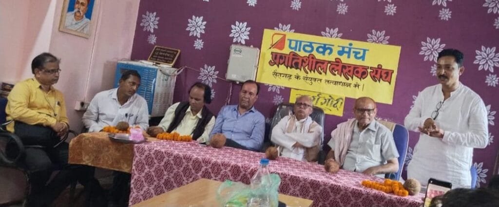 का वाचन किया जिसके बाद छत्तीसगढ़ राज्य अलंकरण से सम्मानित वरिष्ठ साहित्यकार डॉ.जीवन यदु ने इसका सार बताते हुए कहा कि कहानी का मूल संदेश जैसा राजा वैसी प्रजा है। साहित्यकार रवीन्द्र पाण्डेय ने परसाई की व्यंग्य रचना “टार्च बेचने वाला” का वाचन किया जिसके बाद वरिष्ठ पत्रकार एवं युवा कवि अनुराग शाँति तुरे ने कहा कि यह व्यंग्य अंधकार का डर दिखाकर व्यवसाय बनाने की प्रवृत्ति पर सटीक चोट करता है। आज भी रचना प्रासंगिक है क्योंकि आज भी केवल साधु के भेष में तथाकथित संत ही नहीं कई राजनेता, अफसर और बाबू भी झूठा प्रलोभन देकर केवल अपना व्यवसाय कर भोली भाली जनता का शोषण कर रहे हैं। वरिष्ठ कवि एवं शिक्षक विनयशरण सिंह ने कहा कि प्रेमचंद और परसाई की रचनाएं आज भी उतनी ही प्रासंगिक हैं।