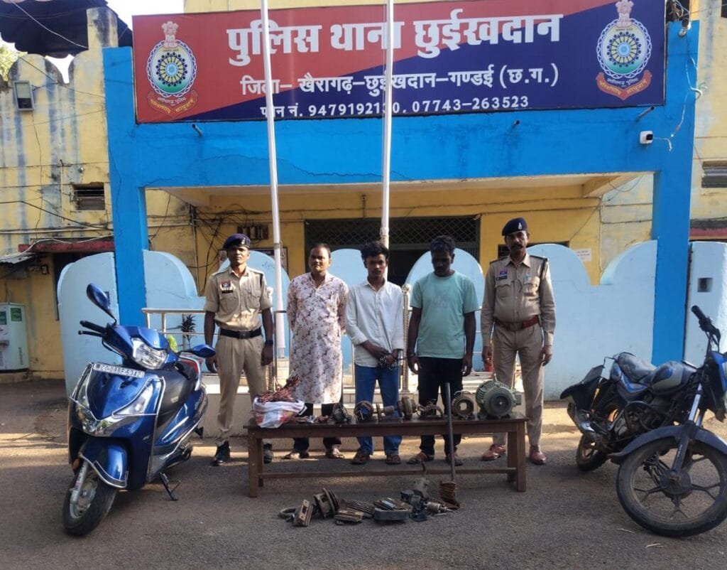सत्यमेव न्यूज छुईखदान। जिले के छुईखदान थाना क्षेत्र में मोटर चोरी के एक मामले का पुलिस ने खुलासा करते हुए तीन आरोपियों को गिरफ्तार किया है जबकि तीन विधि से संघर्षरत बालकों को पुलिस अभिरक्षा में लिया गया है। सभी आरोपियों को न्यायालय में पेश कर न्यायिक रिमांड पर भेज दिया गया वहीं नाबालिगों को किशोर न्यायालय राजनांदगांव में प्रस्तुत किया गया। प्राप्त जानकारी के अनुसार वार्ड क्र.01 छुईखदान निवासी संदीप वैष्णव ने 31 मार्च को थाना पहुंचकर रिपोर्ट दर्ज कराई थी कि ग्राम गोपालपुर स्थित रिपा प्रोजेक्ट के कचरा संग्रहण केंद्र में लगी 9 मोटर और एक बोर मोटर को अज्ञात चोरों ने 26-27 मार्च की दरम्यानी रात शटर का ताला तोड़कर चोरी कर लिया। चोरी गए सामान की कुल कीमत लगभग 3 लाख 90 हजार रुपये बताई गई थी। इस पर पुलिस ने अपराध दर्ज कर जांच शुरू की। जांच के दौरान पुलिस टीम ने मुखबिर की सूचना पर संदेहियों को हिरासत में लेकर पूछताछ की। पूछताछ में आरोपियों ने चोरी की वारदात को अंजाम देना स्वीकार किया। आरोपियों ने बताया कि वे मोटरसाइकिल और स्कूटी से रात के समय घटनास्थल पहुंचे और औजारों की मदद से मोटरों को खोलकर कटर मशीन से काट लिया। बाद में चोरी का सामान स्थानीय कबाड़ियों को कम कीमत पर बेच दिया गया और रकम आपस में बांट ली गई। पुलिस ने कार्रवाई करते हुए आरोपियों के पास से मोटर तांबा, औजार सहित अन्य सामग्री बरामद की है। रवि निषाद के पास से एक मोटर और लोहे का सब्बल रामसुफल निषाद के पास से मोटर के कटे टुकड़े और करीब 4.4 किलो तांबा तथा नासिर खान उर्फ कब्बु के पास से भी मोटर के टुकड़े जब्त किए गए। इसके अलावा नाबालिगों के कब्जे से मोटरसाइकिल स्कूटी नकद राशि और विभिन्न औजार बरामद हुए हैं। गिरफ्तार आरोपियों में रवि निषाद 19 वर्ष निवासी केंवट पारा छुईखदान रामसुफल निषाद 45 वर्ष मूल निवासी जिला सिवनी मध्यप्रदेश हाल निवासी देवपुरा गंडई तथा नासिर खान उर्फ कब्बु 50 वर्ष निवासी पठानपारा छुईखदान शामिल हैं। पुलिस ने सभी आरोपियों के खिलाफ कार्रवाई करते हुए उन्हें न्यायिक रिमांड पर भेज दिया है और मामले की आगे जांच जारी है।