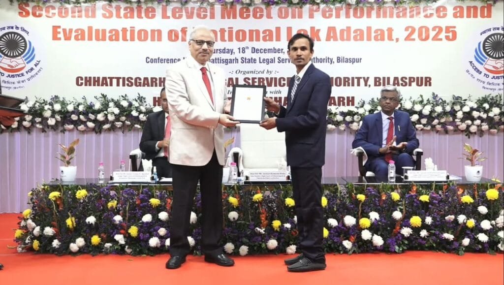 सत्यमेव न्यूज खैरागढ़। छत्तीसगढ़ राज्य विधिक सेवा प्राधिकरण बिलासपुर में आयोजित द्वितीय राज्य स्तरीय बैठक के दौरान पैरालीगल वॉलिंटियर गोलूदास साहू को उनके उत्कृष्ट एवं समर्पित सेवा कार्यों के लिए सम्मानित किया गया। यह सम्मान उन्हें छत्तीसगढ़ उच्च न्यायालय के मुख्य न्यायाधीश एवं छत्तीसगढ़ राज्य विधिक सेवा प्राधिकरण के मुख्य संरक्षक न्यायमूर्ति रमेश सिन्हा के करकमलों से प्रशस्ति पत्र के रूप में प्रदान किया गया। यह राज्य स्तरीय बैठक राष्ट्रीय लोक अदालत के प्रदर्शन एवं मूल्यांकन विषय पर गुरुवार 18 दिसंबर 2025 को छत्तीसगढ़ राज्य विधिक सेवा प्राधिकरण, बिलासपुर के कॉन्फ्रेंस हॉल में आयोजित की गई। कार्यक्रम के मुख्य अतिथि न्यायमूर्ति रमेश सिन्हा रहे। विशेष अतिथि के रूप में छत्तीसगढ़ राज्य विधिक सेवा प्राधिकरण के कार्यकारी अध्यक्ष न्यायमूर्ति संजय के.अग्रवाल तथा विशिष्ट अतिथि के रूप में उच्च न्यायालय विधिक सेवा समिति के अध्यक्ष न्यायमूर्ति पार्थ प्रतीम साहू उपस्थित रहे। बैठक में उच्च न्यायालय के अन्य माननीय न्यायाधीशों की भी गरिमामयी उपस्थिति रही। इस अवसर पर जिला विधिक सेवा प्राधिकरण राजनांदगांव के अध्यक्ष विजय कुमार होता के निर्देशन एवं सचिव निलेश जगदल्ला के मार्गदर्शन में कार्यरत पैरालीगल वॉलिंटियर गोलूदास साहू को वर्ष 2023, 2024 एवं 2025 की राष्ट्रीय लोक अदालतों के दौरान विवादों के सौहार्दपूर्ण एवं शांतिपूर्ण निराकरण में उल्लेखनीय सहयोग तथा निरंतर अथक प्रयासों के लिए सम्मानित किया गया।