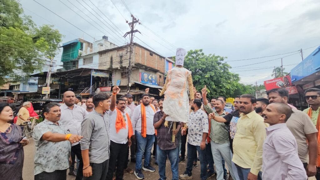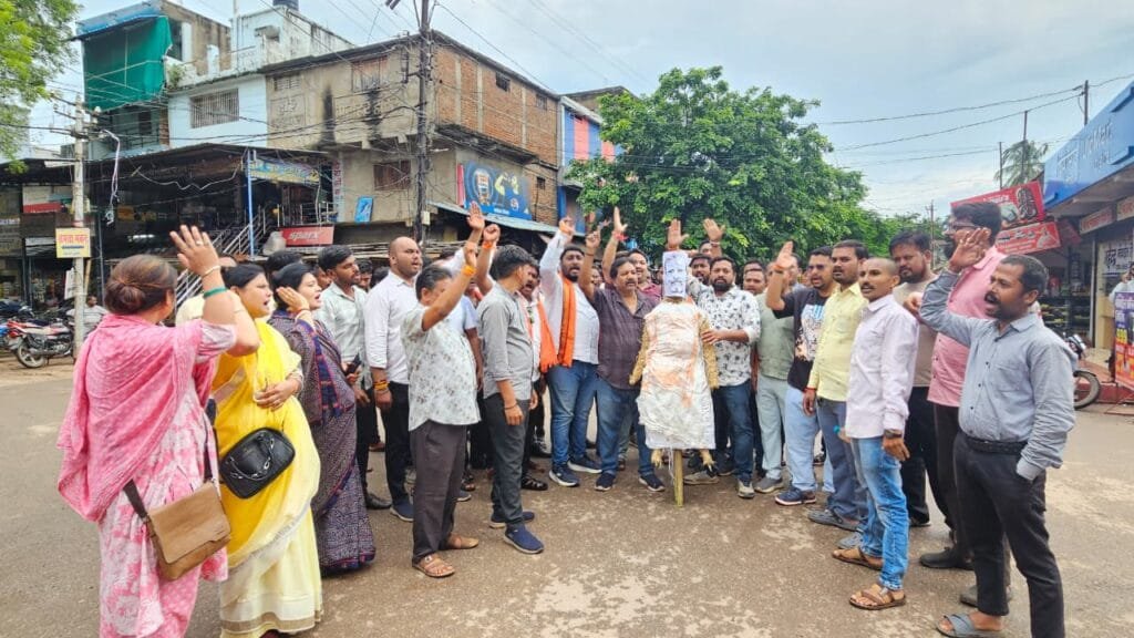 सत्यमेव न्यूज खैरागढ़। बिहार के दरभंगा जिले में कांग्रेस की वोटर अधिकार यात्रा के दौरान कांग्रेस नेता और संसद के नेता प्रतिपक्ष राहुल गांधी द्वारा प्रधानमंत्री नरेंद्र मोदी के खिलाफ कथित अपशब्दों के प्रयोग पर भारतीय जनता युवा मोर्चा (भाजयुमो) ने कड़ी आपत्ति जताई। इसी के विरोध में भाजयुमो खैरागढ़-छुईखदान-गंडई इकाई ने सोमवार को जिला मुख्यालय खैरागढ़ में जम्बो प्रदर्शन किया और राहुल गांधी का पुतला दहन किया। इस दौरान भाजपा कार्यकर्ताओं ने कांग्रेस और राहुल गांधी के खिलाफ जमकर नारेबाजी की। उन्होंने कहा कि प्रधानमंत्री पद की गरिमा का अपमान देश का युवा किसी भी कीमत पर बर्दाश्त नहीं करेगा।