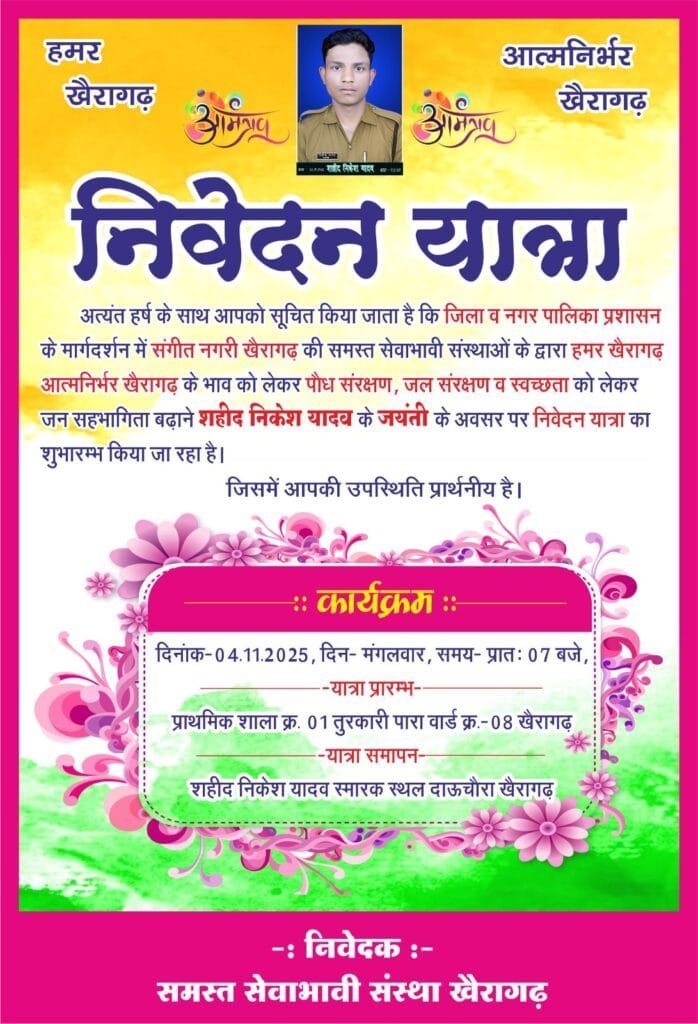 सत्यमेव न्यूज खैरागढ़। शहीद निकेश यादव की जयंती अवसर पर आगामी 4 नवंबर मंगलवार को जिला मुख्यालय खैरागढ़ में निवेदन यात्रा का आयोजन किया जाएगा। यह यात्रा जिला प्रशासन एवं नगर पालिका खैरागढ़ के मार्गदर्शन में तथा संगीत नगरी की समस्त सेवाभावी संस्थाओं के सहयोग से निकाली जाएगी। इस कार्यक्रम का उद्देश्य हमर खैरागढ़, आत्मनिर्भर खैरागढ़ की भावना को साकार करना और समाज में पौध संरक्षण, जल संरक्षण एवं स्वच्छता के प्रति जन-जागरूकता का प्रचार-प्रसार करना है।