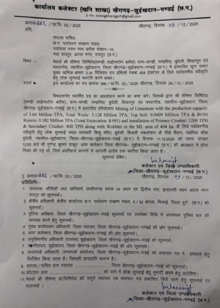 सत्यमेव न्यूज खैरागढ़। सण्डी, पण्डरिया, बुंदेली, विचारपुर और भरदागोंड क्षेत्र में प्रस्तावित श्री सीमेंट लिमिटेड की सण्डी लाइमस्टोन ब्लॉक खनन परियोजना से संबंधित पर्यावरणीय स्वीकृति हेतु निर्धारित लोक सुनवाई को जिला प्रशासन ने आगामी आदेश तक स्थगित कर दिया है। यह सुनवाई 11 दिसंबर 2025 को दोपहर 12 बजे, बुंदेली स्थित सरस्वती शिशु मंदिर के पीछे मैदान में आयोजित की जानी थी। जारी आदेश के अनुसार, अपरिहार्य कारणों के चलते निर्धारित तिथि की सुनवाई को फिलहाल स्थगित किया गया है। कलेक्टर एवं जिला दण्डाधिकारी, खैरागढ़-छुईखदान-गंडई द्वारा हस्ताक्षरित आदेश में बताया गया है कि परियोजना अंतर्गत 404 हेक्टेयर क्षेत्र में प्रतिवर्ष 3.64 मिलियन टन चूना पत्थर, 5.128 मिलियन टन अपशिष्ट, 0.0409 मिलियन टन टॉप सॉइल तथा 0.182 मिलियन टन आरओएम रिजेक्ट्स उत्खनन का प्रस्ताव शामिल है साथ ही 1200 टीपीएच की प्राइमरी क्रशर और 400 टीपीएच की सेकेंडरी क्रशर स्थापित करने का प्रावधान भी रखा गया है। गौरतलब है कि इस सुनवाई की अध्यक्षता अपर कलेक्टर सुरेन्द्र कुमार ठाकुर द्वारा की जानी थी। जिला प्रशासन ने अपने पत्र में स्पष्ट किया है कि परिस्थितियों के कारण यह आयोजन अगले आदेश तक स्थगित रहेगा।