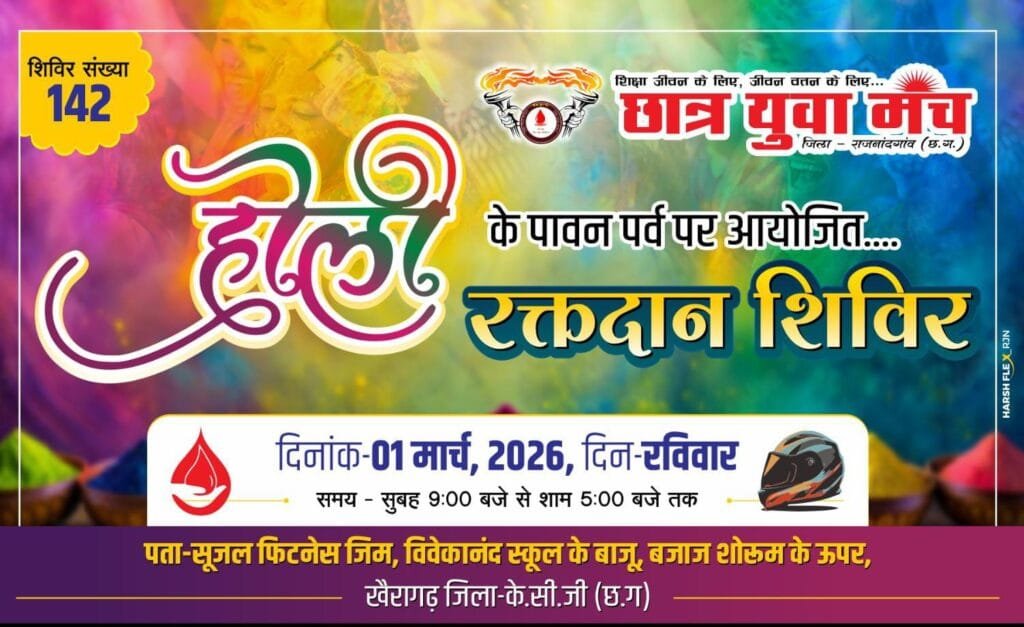 सत्यमेव न्यूज खैरागढ़। नगर में सामाजिक जागरूकता और जनसेवा को प्रोत्साहित करने की दिशा में एक नई पहल की जा रही है। छात्र युवा मंच एवं सुजल फिटनेस जिम के संयुक्त तत्वावधान में 1 मार्च 2026 रविवार को रक्तदान शिविर एवं ड्राइविंग लाइसेंस शिविर का आयोजन किया जाएगा। यह शिविर सुजल फिटनेस जिम परिसर विवेकानंद स्कूल के बाजू बजाज शोरूम के ऊपर खैरागढ़ में प्रातः 9 बजे से सायं 5 बजे तक संचालित होगा। आयोजकों के अनुसार रक्तदान शिविर का उद्देश्य अस्पतालों में रक्त की कमी को दूर करना और जरूरतमंद मरीजों को समय पर सहायता उपलब्ध कराना है। रक्तदान को महादान बताते हुए युवाओं से अधिक से अधिक संख्या में भागीदारी की अपील की गई है। इसी के साथ ड्राइविंग लाइसेंस शिविर में नए लाइसेंस बनवाने एवं नवीनीकरण की सुविधा एक ही स्थान पर उपलब्ध कराई जाएगी। इससे नागरिकों को प्रशासनिक प्रक्रिया में सहूलियत मिलेगी तथा सड़क सुरक्षा के प्रति जागरूकता भी बढ़ेगी। रक्तदान करने वाले सभी दाताओं को सम्मानस्वरूप एक एक हेलमेट प्रदान किया जाएगा जिससे वे सड़क सुरक्षा का संदेश भी समाज तक पहुंचा सकें। छात्र युवा मंच के पदाधिकारियों ने बताया कि सामाजिक सरोकार से जुड़े ऐसे कार्यक्रम आगे भी निरंतर आयोजित किए जाते रहेंगे। आयोजकों ने नगरवासियों युवाओं एवं सामाजिक संगठनों से अधिकाधिक उपस्थिति की अपील की है।